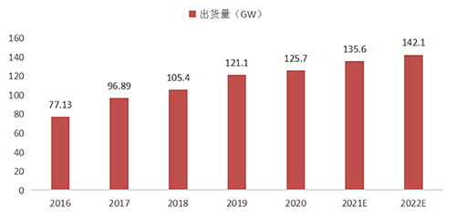 市場現狀:隨著光伏技術的不斷提升,光伏發電成本隨之下降,未來光伏發電增長空間大。近年來,全球光伏支架出貨量維持穩定增長,受到疫情的影響,2020年增速減緩。隨著疫情的有效控制及可再生能源的前景廣闊,預計2022年全球光伏支架出貨量將達142.1GW。
